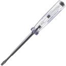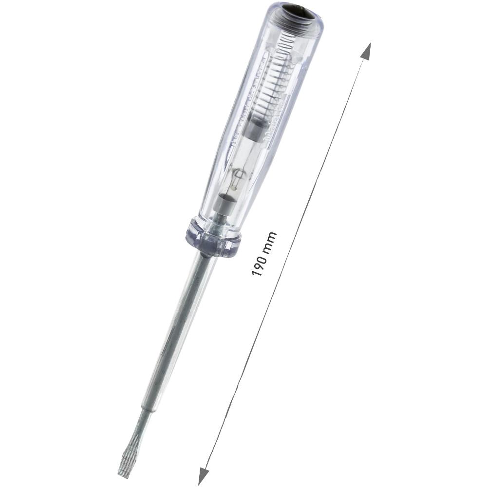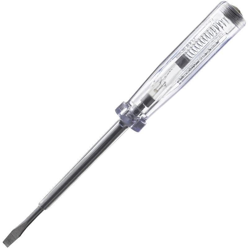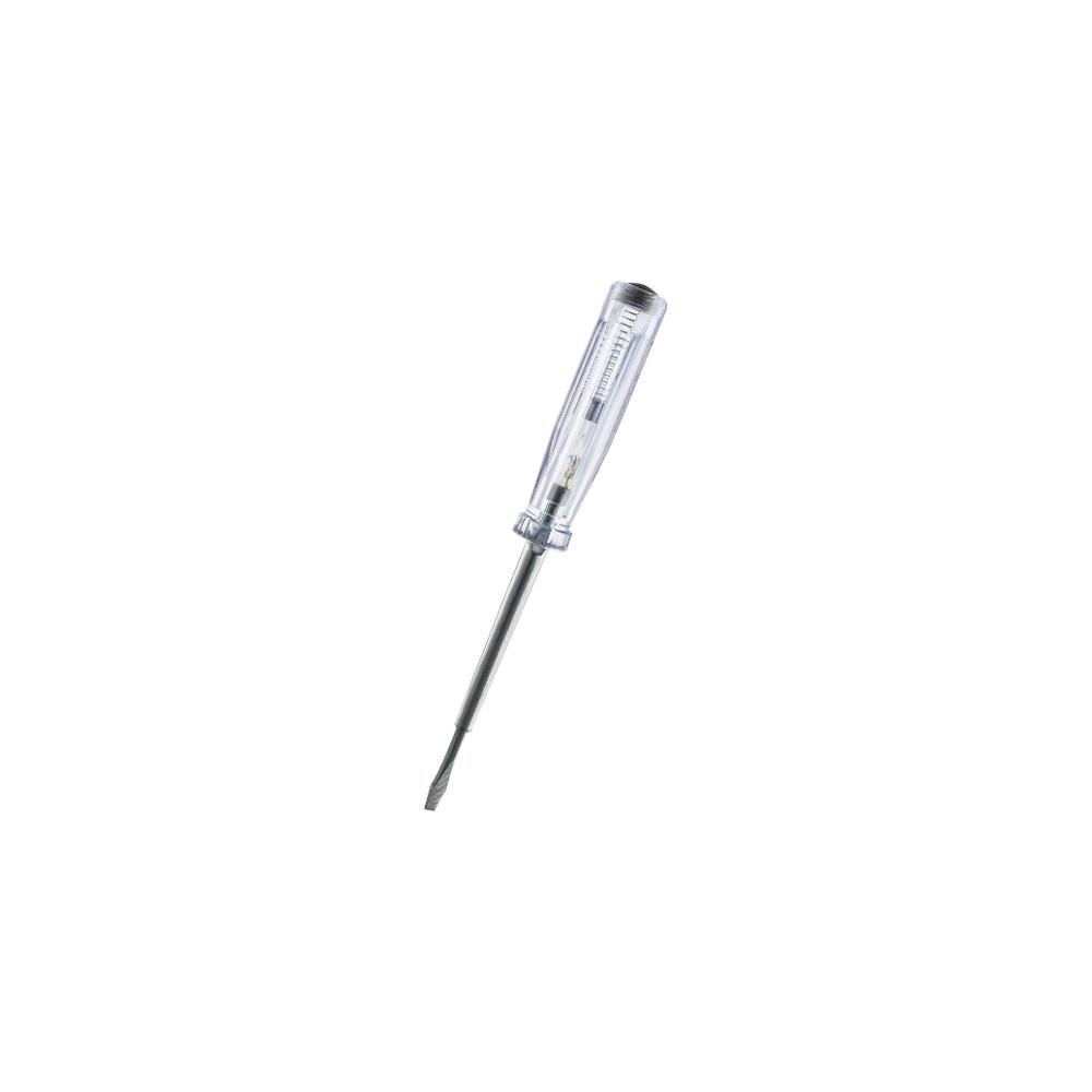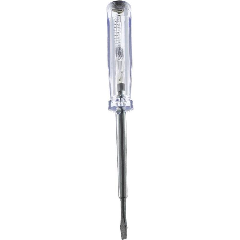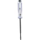 1pólová skúšačka pre 220 - 250 V AC. Rukoväť z bieleho transparentného plastu. Testovacia elektróda zabudovaná vo skrutkovači