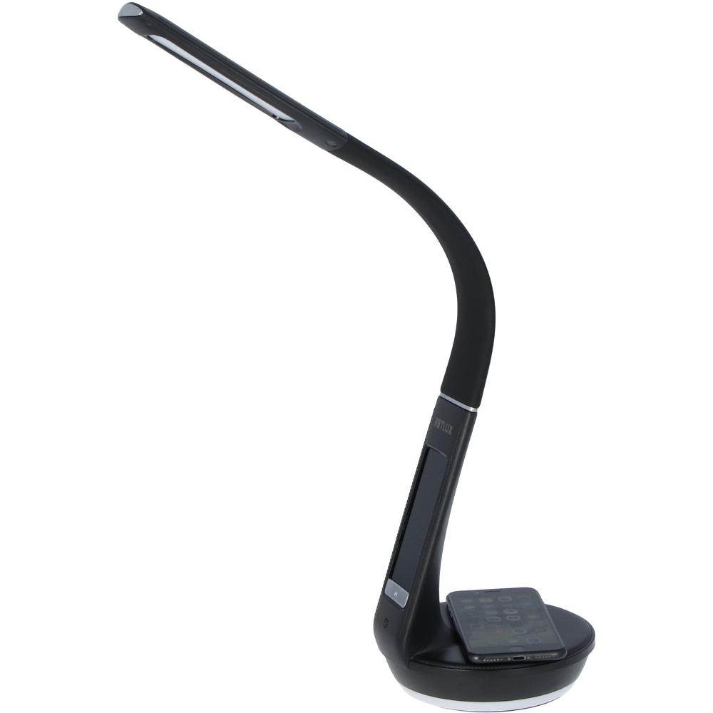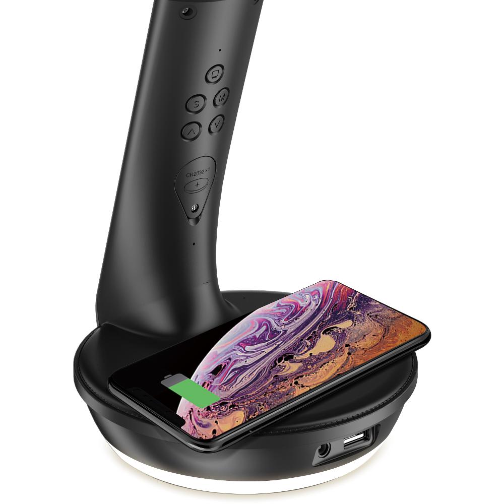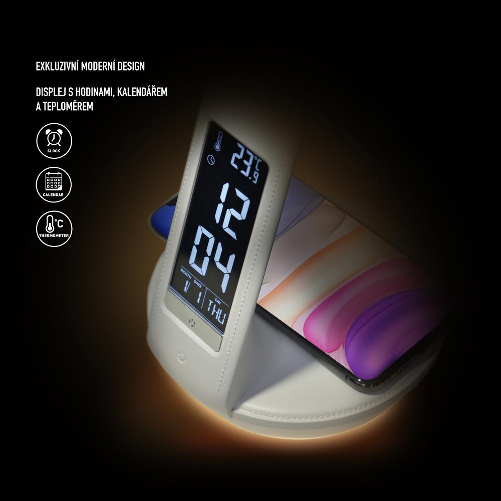LED stolná lampička s ambientným podsvietením, hodinami, kalendárom, teplomerom, bezdrôtovým nabíjaním Qi a USB výstupom.