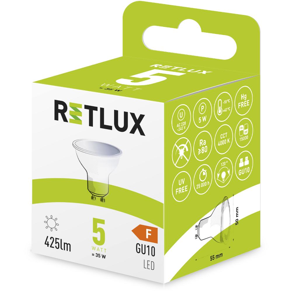 Reflektorové LED žiarovky Retlux do pätice GU10 sa používajú najčastejšie v podhľadoch, bodových svetlách či v kúpeľniach. Jedná sa o menšie žiarovky, ktoré spoľahlivo osvietia menšiu plochu či vo väčšom množstve aj rozmernejšiu miestnosť. Na výber máte hneď niekoľko variantov od 5 W do 9 W, čo by pri bežných žiarovkách znamenalo 37 W až 61 W.
