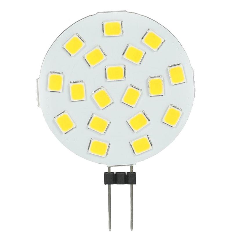 LED žiarovka tanieriková • Príkon: 2 W • Patica G4 • 12V DC • 3000K - teplá biela • Životnosť viac ako 15 000h • Svetelný tok: 160 lm • 2 W # 17W (pri klasickej žiarovke) • Rozmery: 4x30x40mm (dxšxh)