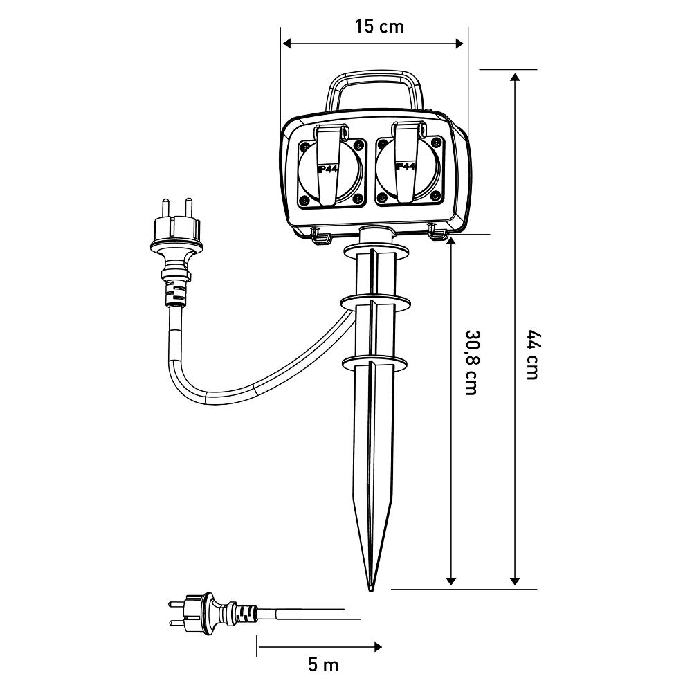 Vonkajšia dvojnásobná zásuvka so zapichovacím plastovým tŕňom, IP44, 3x1,5mm2, max. 16A / 3680W