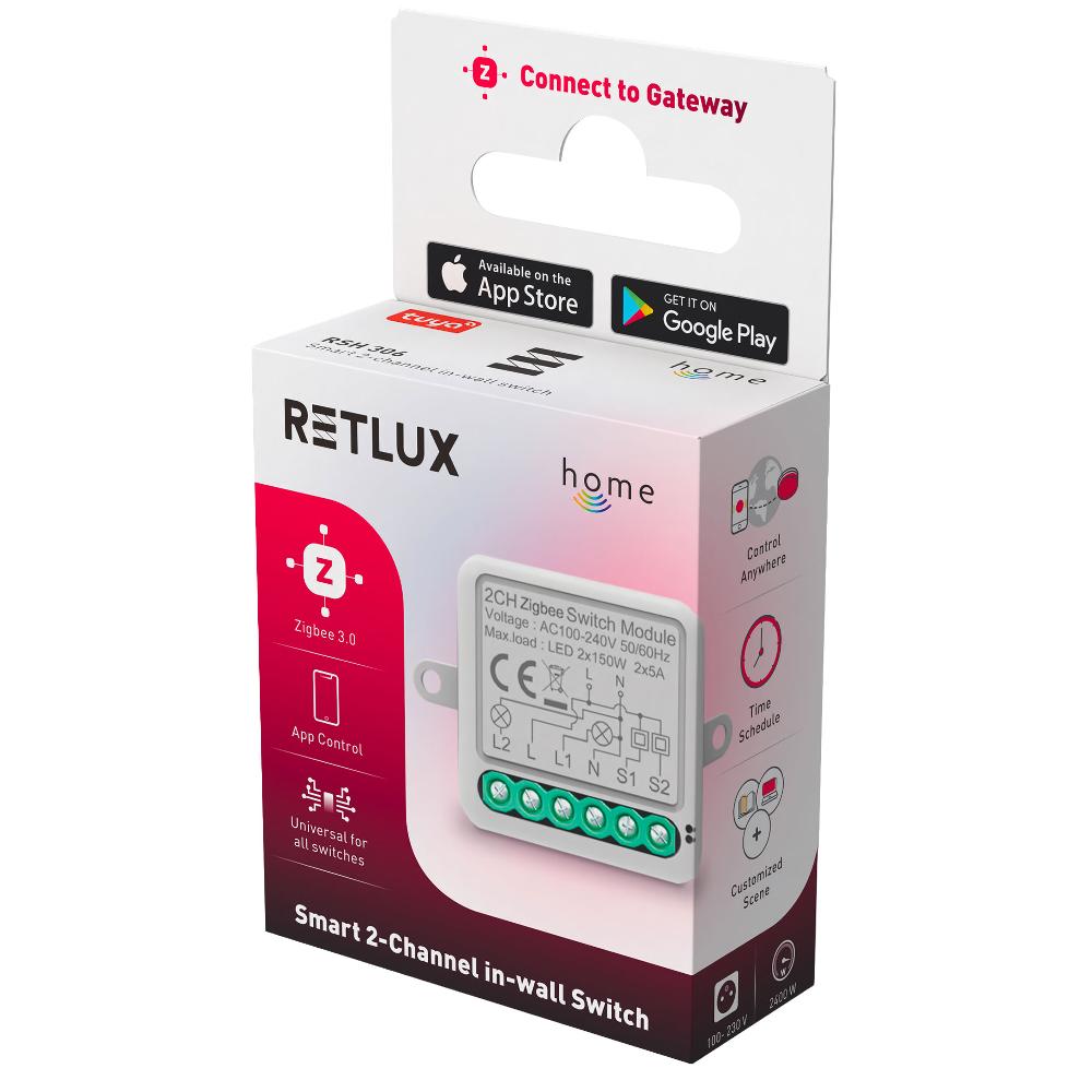 Užívatelia môžu zariadenie ovládať hlasom cez Alexa alebo Google Home, prípadne pomocou aplikácie RETLUX Home, ktorá umožňuje časové plánovanie, vzdialené ovládanie, skupinové riadenie a zdieľanie prístupu s ďalšími členmi domácnosti. S vysokou zaťažiteľnosťou 2 × 5 A a univerzálnym vstupným napätím je vhodný pre širokú škálu spotrebičov a svetiel. Možnosť bezdrôtového prepojenia viacerých vypínačov navyše prináša vyššie pohodlie, úsporu nákladov a jednoduchú inštaláciu.