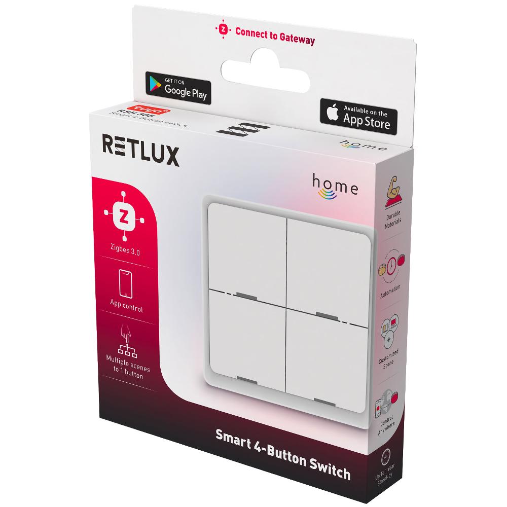 RSH 305 je smart scénické tlačidlo, ktoré vďaka technológii ZigBee 3.0 umožňuje rýchle a spoľahlivé prepojenie s domácimi zariadeniami a ponúka široké možnosti automatizácie. Je ľahké, prenosné a dá sa ľahko umiestniť kamkoľvek. Kompatibilita s Google Home a Alexou umožňuje hlasové ovládanie, pričom pomocou aplikácie RETLUX home je možné tlačidlo jednoducho nastaviť a vytvárať vlastné scény.