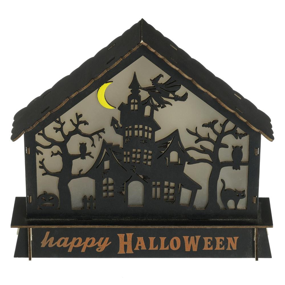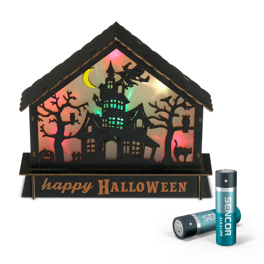 Strašidelný hrad 6 LED, meniace sa farby, RGB svetlo, drevo, napájanie 2x AA, IP20, vnútorné použitie