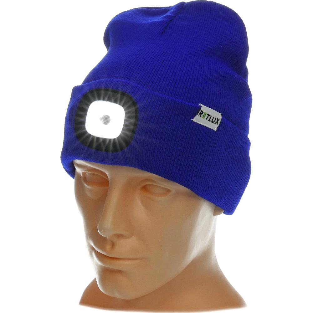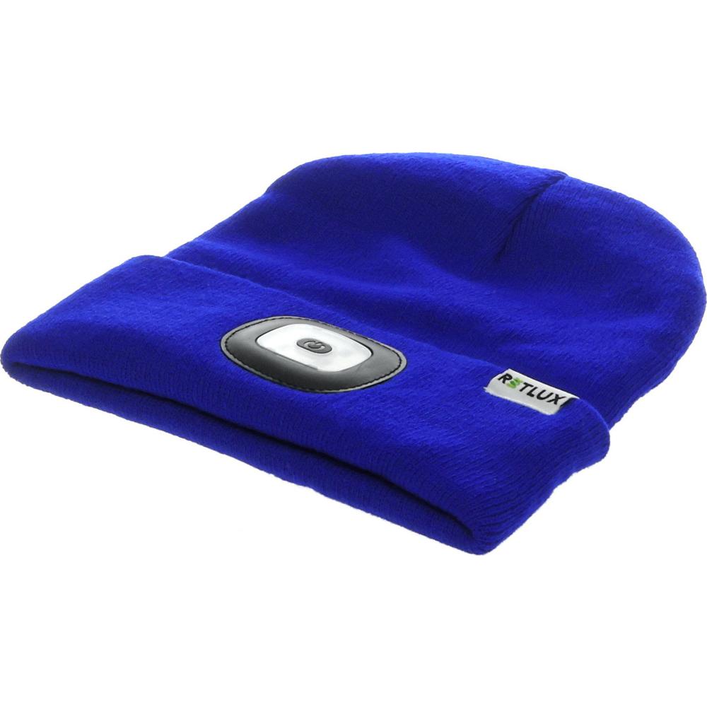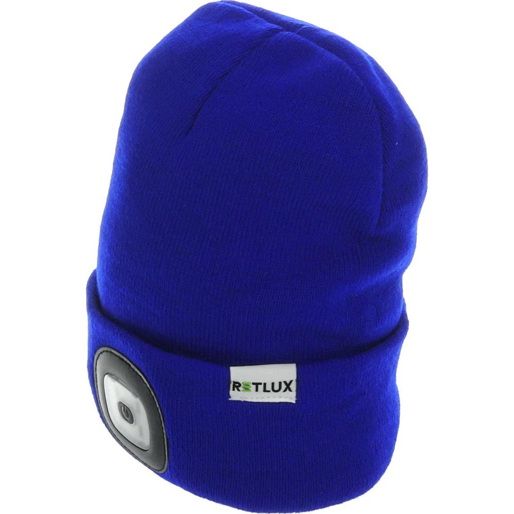 Svietiaca nabíjacia čiapka modrej farby s LED svietidlom RETLUX. Svetlo je možné jednoducho vybrať a čiapku vyprať.