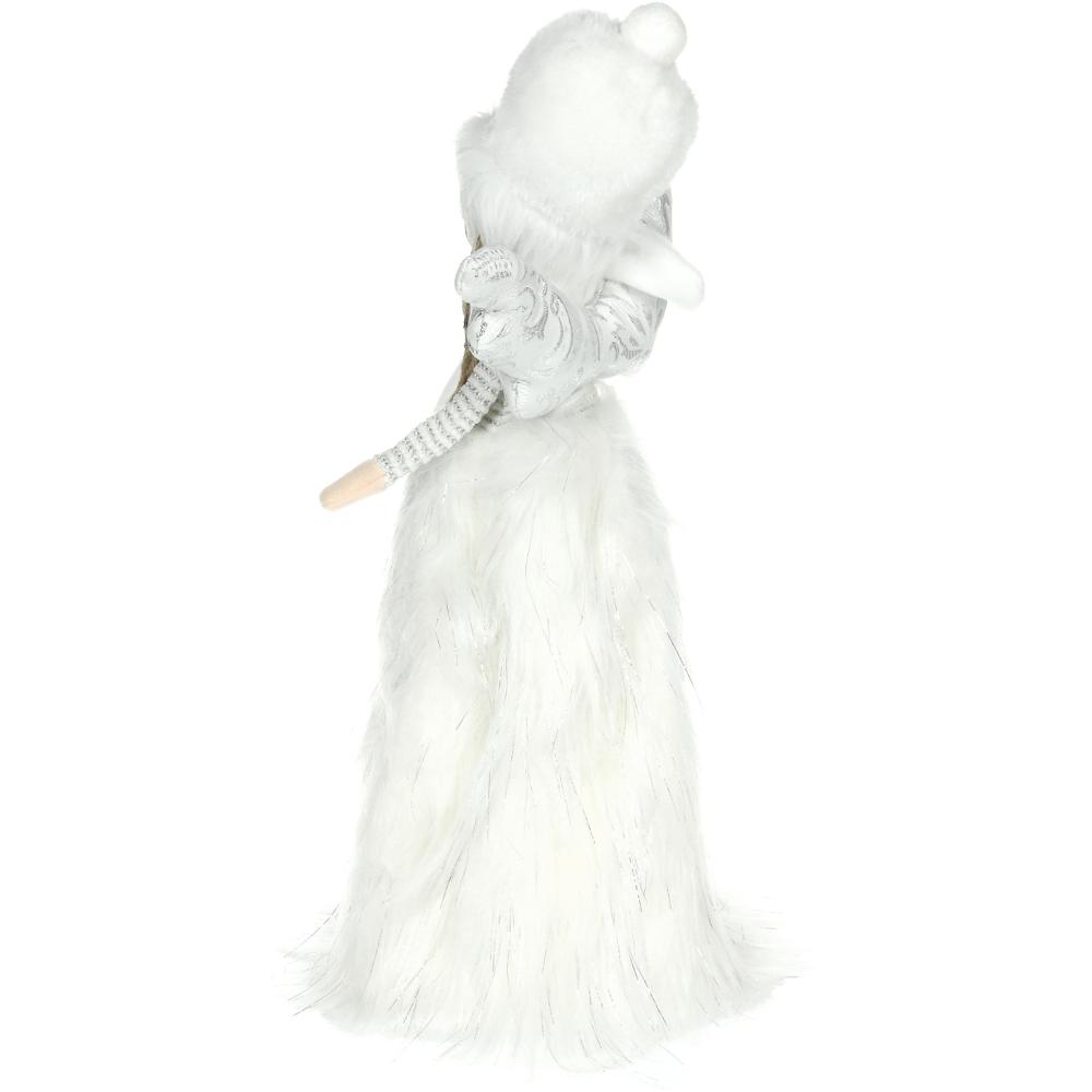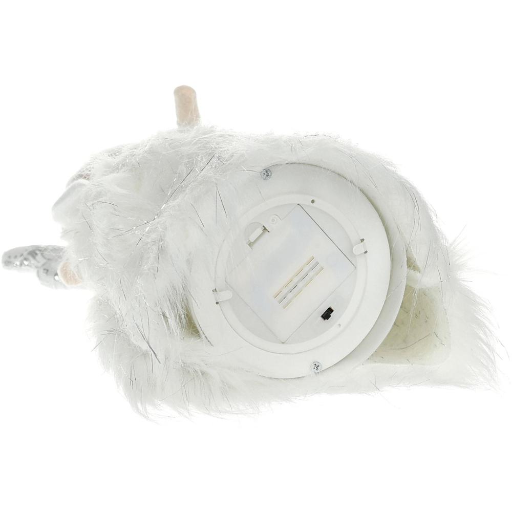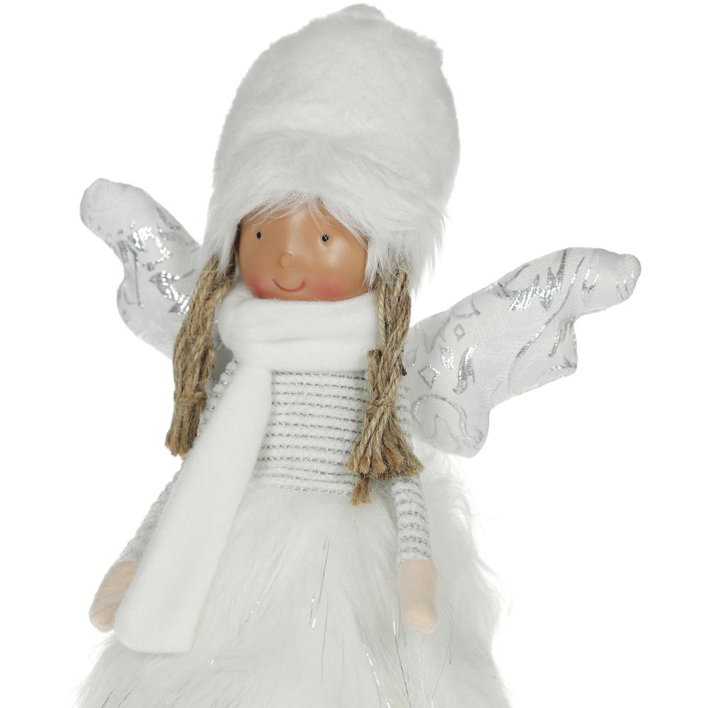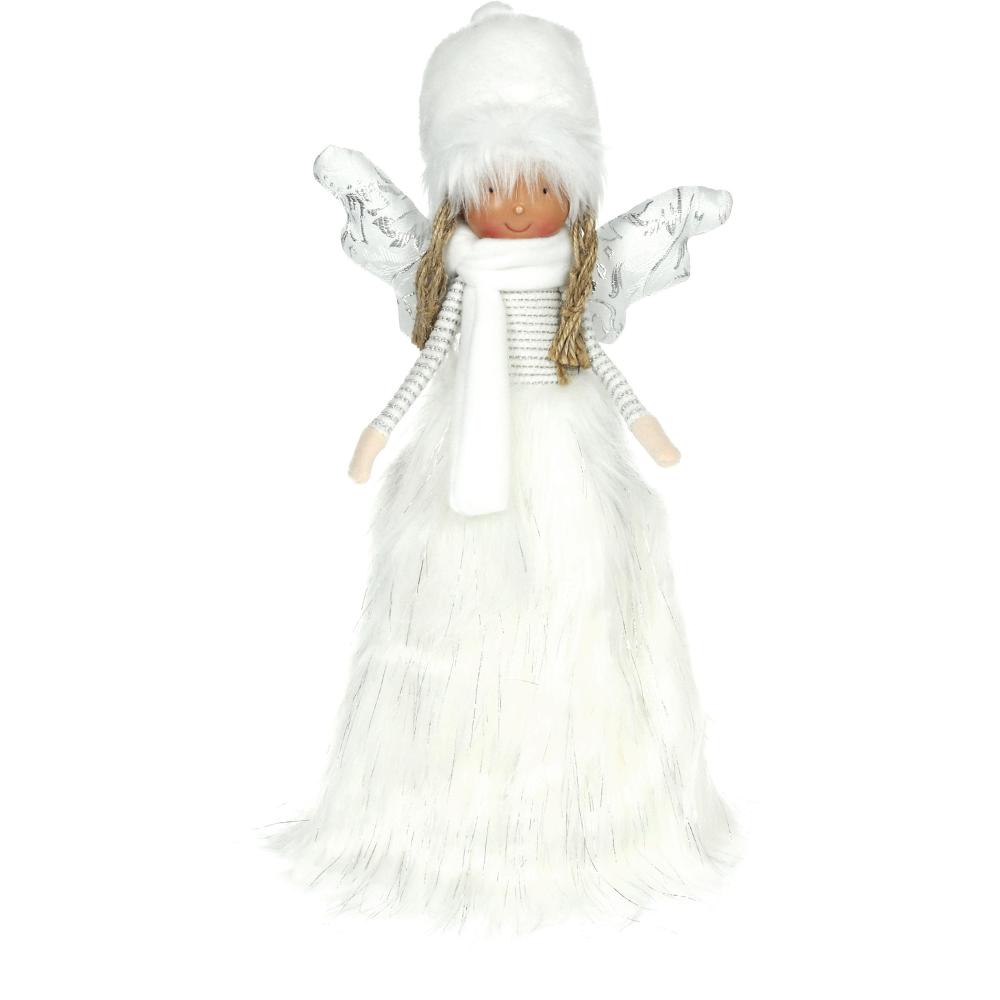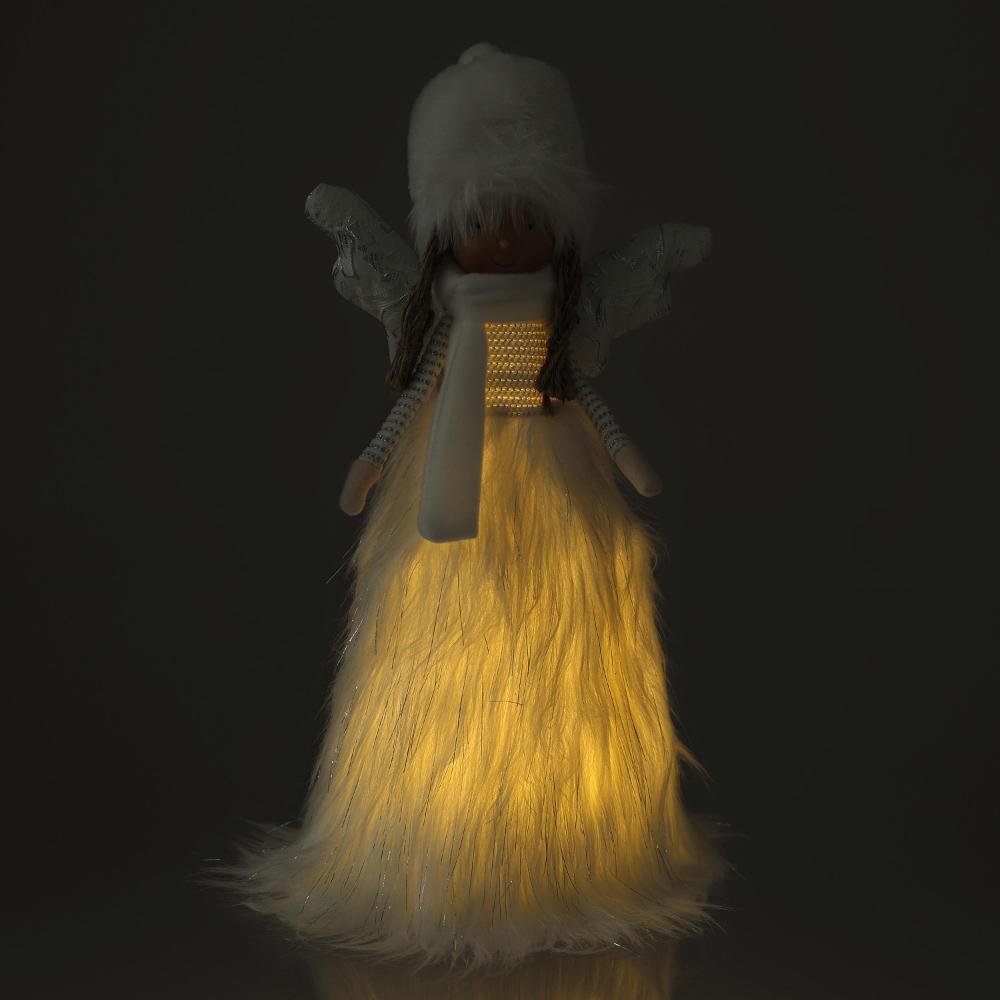Anjel z bieleho súkna so žiariacou sukňou. Po zapnutí sa sukňa rozsvieti teplou bielou farbou pomocou 6 LED diód. Veľkosť 21 x 17 x 47 cm. 3 AA batérie nie sú súčasťou balenia. Používajte iba v interiéri.