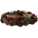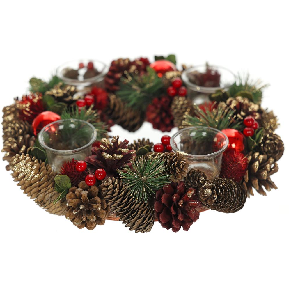 Adventný veniec zo šišiek, ihličiek a guličiek posypaný zlatými trblietkami