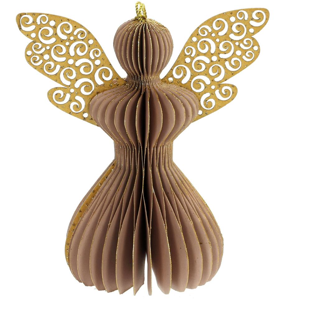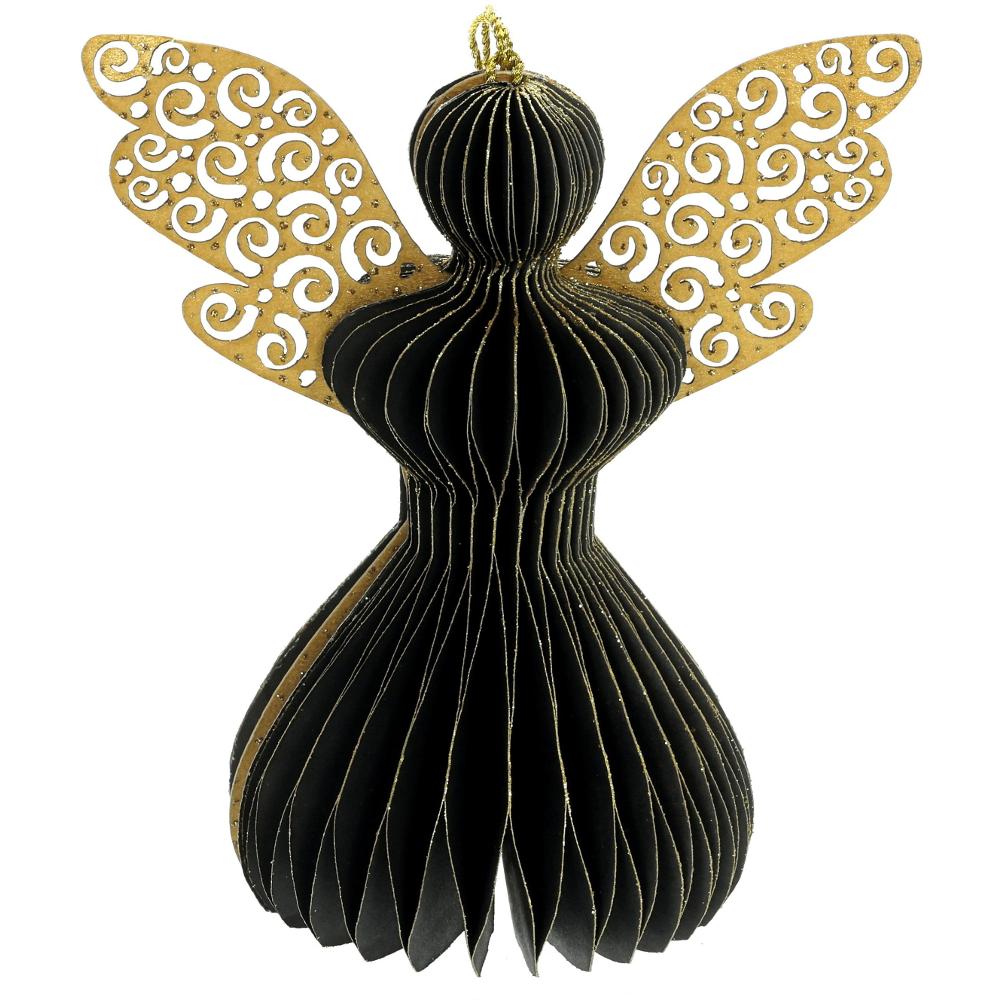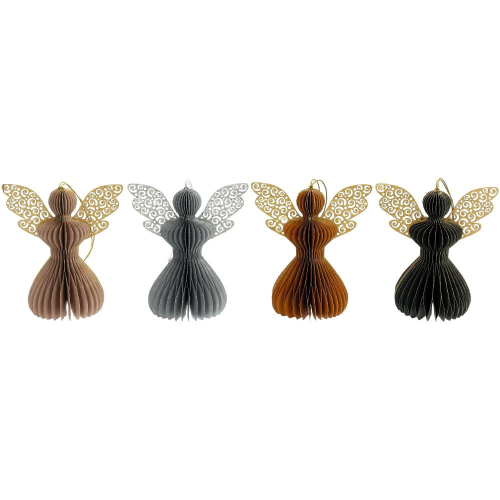 4 krásne papierové ozdoby v tvare anjelov. Skladané ornamenty majú tvar plástu so zlatými trblietkami na okrajoch. Sada obsahuje dekorácie v štyroch farbách: čierna, ružové zlato, horčica a striebro. Používajte iba v interiéri.